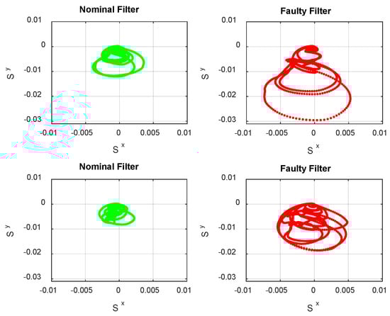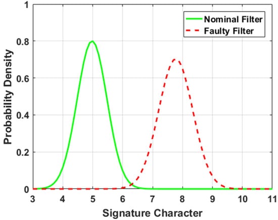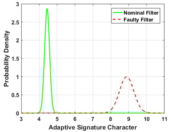Probability density approximations based on normal law using adaptive signature character for nominal and faulty filters.