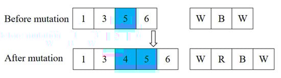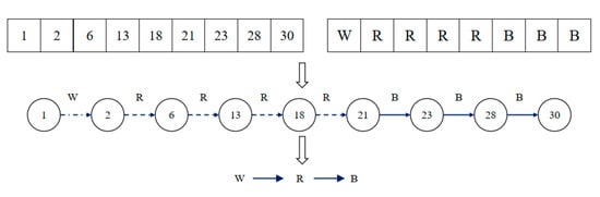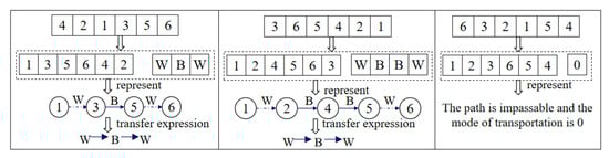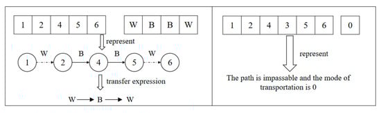 The V-GA chromosome encoding length varies based on the number of nodes in the route. Each chromosome consists of two segments: the first segment represents the sequence of nodes traversed, while the second segment specifies the mode of transportation between nodes. If a node is not part of the travel path, its corresponding transportation mode is denoted as 0. Consecutive identical transportation modes within the second segment are considered a continuous ride, meaning no interchange occurs. However, a direct switch between bus and rail, or a transition from bus to rail via walking, is classified as an interchange. In contrast, walking at the start or end of a journey is not considered an interchange. Figure 3 illustrates the encoding and decoding correspondences for two example travel paths within the network introduced in Figure 2. Specifically, “W”, “B” and “R” in the following figures stand for “Walk”, “Bus” and “Rail”, respectively.