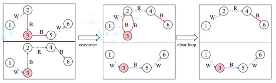 During crossover with identical nodes, duplicate genes may appear, resulting in a loop in the path (as shown in Figure 6), which needs to be eliminated. To resolve this, the genes between the duplicates are deleted. For instance, consider two valid parent paths, 1-2-3-5-6 and 1-3-2-4-6. If node 3 is chosen as the crossover point, the resulting offspring are 1-2-3-2-4-6 and 1-3-5-6. One of these offspring contains a loop, which is then removed by deleting the duplicated node, yielding the valid individual 1-2-4-6.