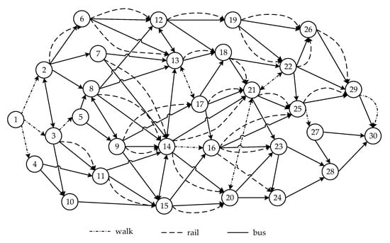 When constructing numerical examples, considering that self-generated random data might lack authority and representativeness, the instances used in this paper are modified versions of the standard Solomon lxiv instances. In the Solomon instances, data are categorized into three types: clustered distribution (C class), random distribution (R class), and semi-clustered distribution (RC class). This paper selects the coordinates from point 2 to point 31 in Solomon’s C101 instance, corresponding to the nodes 1 to 30 in Figure 11, to obtain the distances between nodes. The intervals between departures of different transportation modes and the departure and arrival times are shown in Table 2. The speeds of various transportation modes are given in Table 3. Transfer time costs and waiting time costs are simplified, and detailed unit travel costs are provided in Table 4. A passenger departs from starting point 1 to destination 30 at 8:00 (480 min). How should travel be organized to minimize the time required to reach the destination under the constraints of limited travel expenses () and the number of transfers ()?