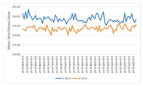 A population size of and a maximum number of iterations () were set. The computations were conducted using MATLAB 2018b on a computer equipped with an Intel Core i5 CPU and 4.0 GB of RAM. By continuously adjusting the crossover probability (Pc) and the mutation probability (Pm), V-GA and F-GA were executed for 8 runs with varying parameters. The best fitness value (B), mean best fitness value (A), average runtime (Time), and mean number of iterations (N) required to reach the optimal value for the first time were recorded. The results are presented in Table 5.