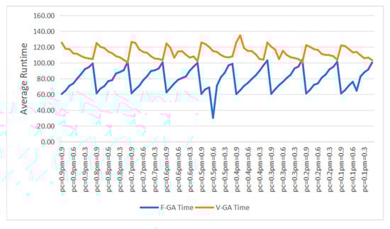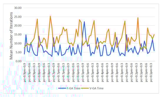 Detailed comparative charts of the average best fitness values, the average runtime, and the mean number of iterations until reaching the optimal value for the two algorithms under different parameters are shown in Figure 13, Figure 14 and Figure 15 respectively. It can be observed that (1) under the same parameters, the best fitness values obtained by the V-GA algorithm are lower than those of the F-GA algorithm, making the V-GA algorithm more effective than the F-GA algorithm; (2) under the same parameters, the runtime of the F-GA algorithm is shorter than that of the V-GA algorithm; and (3) in most cases, the mean number of iterations until reaching the optimal value for the first time is smaller for the F-GA algorithm compared to the V-GA algorithm.