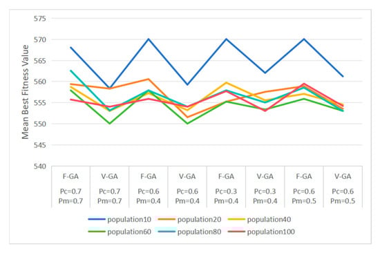 The above analysis found that the V-GA algorithm achieves the smallest mean best fitness value with two parameter combinations, crossover probability Pc = 0.7 and mutation probability Pm = 0.7, as well as Pc = 0.6 and Pm = 0.4. For the F-GA algorithm, the smallest mean best fitness value is achieved when the crossover probability Pc = 0.3 and the mutation probability Pm = 0.4. Another parameter combination closest to this value is Pc = 0.6 and Pm = 0.5. Under these parameter combinations, the impact of different population sizes on the algorithm is analyzed. Detailed data are shown in Table 6.
