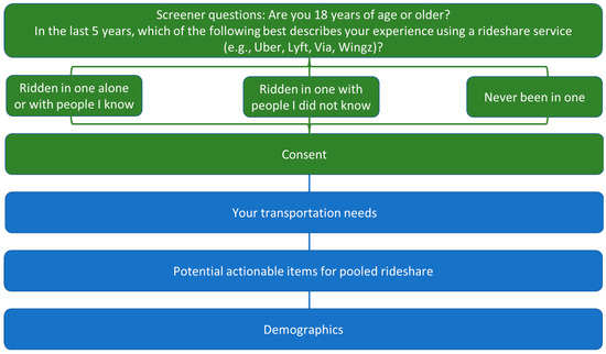 The flow diagram in Figure 1 provides an overview of the online survey’s design. First, potential participants completed two screening questions: age, to ensure all interested individuals were at least 18 years of age, and previous rideshare experience. The previous rideshare experience question was used to recruit an equal number of respondents with and without rideshare experience. After providing consent, participants expressed their willingness to use pooled rideshare prior to providing insights into their transportation needs, such as current mobility uses, frequency of rideshare usage, and reasons to use pooled rideshare. Subsequently, the following section explored the 77 potential actionable items described in Section 2.1. using a 4-point scale (strongly agree, agree, disagree, and strongly disagree). Then, respondents were asked for a second time about their willingness to use pooled rideshare after consideration of the actionable items. Finally, the demographic information was obtained.