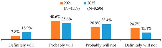 The dataset includes 4250 participants with rideshare experience (51.2%) and 4046 participants without (48.8%). When participants were asked about their willingness to consider a pooled rideshare service as it operates today, 15.9% reported they “definitely will” use pooled rideshare when available. Conversely, 15.1% of participants stated they “definitely will not” use pooled rideshare. When comparing these percentages to the same question from the 2021 survey (Figure 2), the percentage of those who “definitely will” doubled, increasing from 7.8% in 2021 to 15.9% in 2025. Notably, those who “definitely will not” use pooled rideshare declined from 24.7% in 2021 to 15.1%, suggesting a reduction in strong opposition against pooled rideshare services. This pattern is encouraging, suggesting a growing willingness to use pooled rideshare.