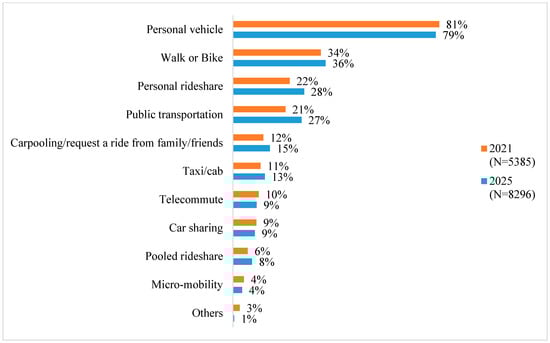 Participants’ typical transportation methods were examined and presented in comparison to the 2021 dataset (see Figure 3). Due to multiple transportation alternatives, respondents could select more than one option to capture the diversity of their transportation habits. In the 2025 sample, the majority of participants drive using their “personal vehicle” (79%), followed by “walk or bike” (36%), “personal rideshare” (28%), and “public transportation” (27%). Sharing a ride options, whether “carpooling/request a ride from family or friends” (15%), “car sharing” (9%), or “pooled rideshare” (8%), were utilized by roughly 35% of the users. The pattern of transportation options used between 2021 and 2025 remained consistent.