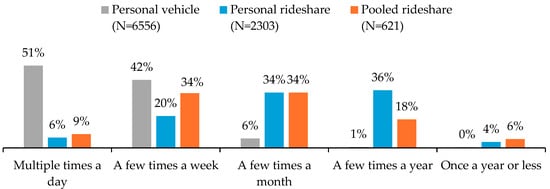 Next, the frequency of use for personal vehicles, personal rideshare services, and pooled rideshare services were examined (Figure 4). Among personal vehicle users (N = 6556), the vast majority used their vehicles “multiple times a day” (51%) or “a few times a week” (42%), highlighting the reliance on personal vehicles in the United States for daily transportation.