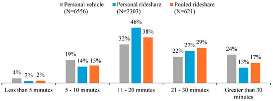 The average duration of participants’ most recent trips using personal vehicles, personal rideshare, and pooled rideshare services is illustrated in Figure 5. Across all three transportation modes, the most common trip duration was “11–20 min”, suggesting a shared duration of travel among users. For personal and pooled rideshare users, the next most common duration was “21–30 min”. Approximately 67% of pooled rideshare trips fell between 11 and 30 min, which likely included the additional time required for multiple passenger pick-ups and drop-offs. Shorter trips were less frequent in all three groups. These findings suggest that personal and pooled rideshare services are most commonly used for trips under 30 min. Pooled rideshare may involve longer durations due to its shared nature.