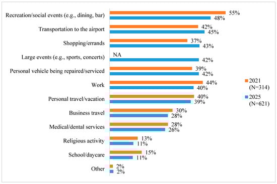 Regarding the typical reasons for using a pooled rideshare service, responses were collected in both 2021 (N = 314) and 2025 (N = 621), allowing for a direct comparison of trends over time (Figure 6). The most common reasons for using a pooled rideshare were “recreation/social events (e.g., dining or bar)” (55% in 2021 vs. 48% in 2025), “transportation to the airport” (42% vs. 45%), and “shopping/errands” (37% vs. 43%). A new option introduced in the 2025 survey, “large events (e.g., sports or concerts; 42%)” and “personal vehicle being repaired/serviced” was selected by (39% vs. 42%) of participants, highlighting the importance of pooled rideshare as a transportation option for planned outings and logistical needs. Work-related trips (44% vs. 40%) and personal travel/vacation (40% vs. 39%) also remained common use cases. Overall, the findings suggest that pooled rideshare continues to be a useful option for leisure and essential trips, especially trips to the airport.