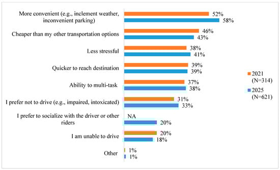 Next, participants’ reasons for choosing to use a pooled rideshare service were explored (Figure 7). The most frequent reasons for choosing pooled rideshare were “more convenient (e.g., inclement weather or inconvenient parking)” (52% in 2021 vs. 58% in 2025) and “cheaper than my other transportation options”. Additional benefits of pooled rideshare continue to be “less stressful”, “quicker to reach destination”, and “ability to multi-task”. Overall, the findings suggest that convenience remains the main reason for choosing pooled rideshare, with increasing emphasis on cost savings and stress reduction.