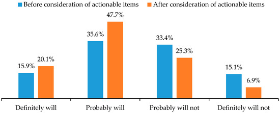 This study assessed the potential effectiveness of the proposed actionable items by comparing willingness to use pooled rideshare before and after exposure to these 77 items. This simple pre–post comparison indicates a positive shift in willingness to use pooled rideshare, with the proportion of participants who responded “definitely will” increasing from 15.9% to 20.1% and those selecting “probably will” rising from 35.6% to 47.7%. Meanwhile, reluctance to use pooled rideshare decreased, as those who selected “probably will not” declined from 33.4% to 25.3%, and “definitely will not” dropped from 15.1% to 6.9%. These findings suggest that addressing users’ concerns through targeted improvements may increase the likelihood of pooled rideshare adoption, yet these differences may be partially due to study participants recently reading the actionable items. It will be valuable to have longitudinal data to see how participants’ views and actual rideshare usage changes over time as actionable items are introduced to the market.