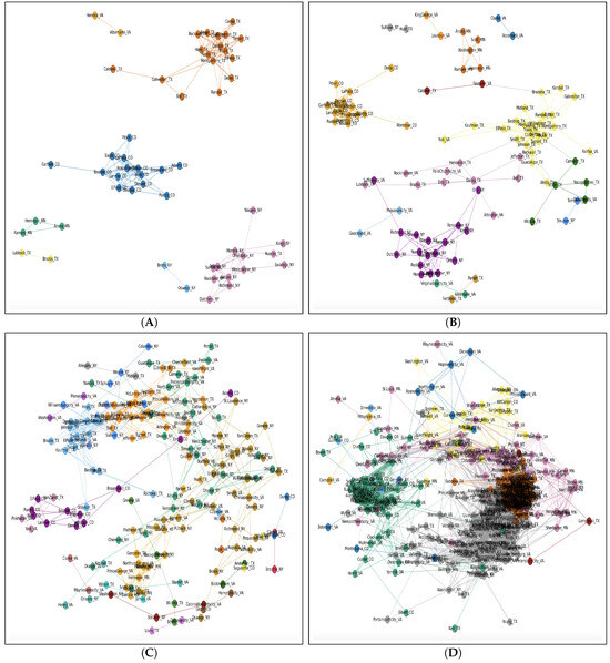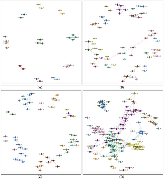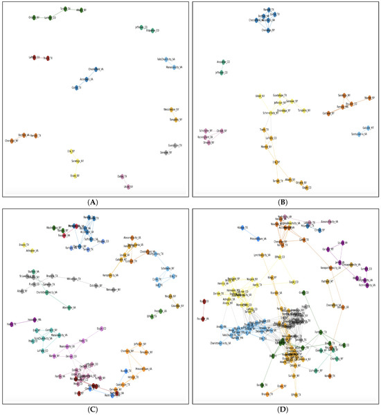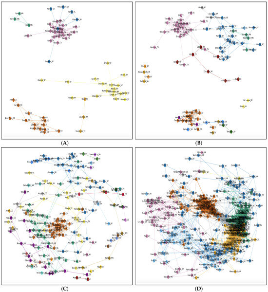 Correlation networks of ALL types of chargers growth (2019–2023) used in Early Adoption scenario using different time granularities. (A): Correlation network for monthly data—threshold: 0.7000. (B): Correlation network for bi-monthly data—threshold: 0.7848. (C): Correlation network for quarterly data—threshold: 0.8439. (D): Correlation network for bi-annually data—threshold: 0.8500.