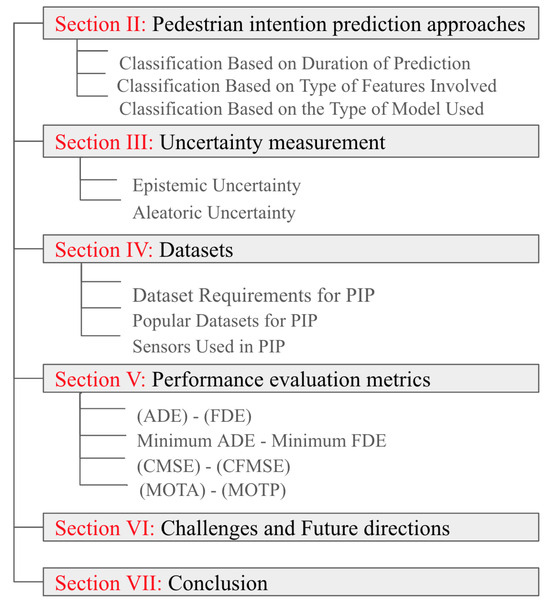 The paper is organized as follows: Section 2 reviews existing surveys on pedestrian intention prediction methods and highlights the role of uncertainty in these models. Section 3 classifies and analyzes various approaches for predicting pedestrian behavior, focusing on trajectory prediction and intention recognition models. Section 4 discusses uncertainty in PIP, exploring the different types of uncertainty (e.g., epistemic and aleatoric) and how they are handled in PIP. Section 5 describes key datasets and sensors used in PIP tasks. Section 6 discusses evaluation metrics for assessing the performance of PIP models. Section 7 discusses the challenges in PIP, such as the complexity of human behavior, the limitations of current models, and the integration of uncertainty. Additionally, it explores future research directions to address these challenges. Finally, Section 8 concludes the study by summarizing the main findings and suggesting further advancements in the field. The organization of this paper is visually outlined in Figure 1.