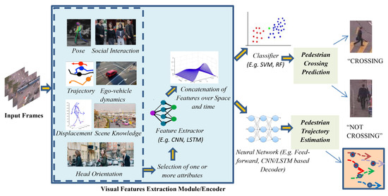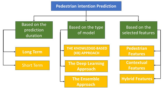 The prediction of pedestrian intentions typically follows three main stages: the input stage, the feature extraction and encoding stage, and the decoding or classification stage, depending on the required output, as illustrated in Figure 2. The input stage consists of frames extracted from video sequences, which can be obtained in real-time or from pre-recorded footage captured by cameras positioned at different angles. During pre-processing, these frames are analyzed to extract relevant attributes based on the specific needs of the proposed algorithm. Various feature extraction techniques encode spatial and temporal features. In the final stage, a classifier such as a neural network-based one is utilized to predict pedestrian crossings and forecast trajectories. The subsequent sections present a detailed categorization of different pedestrian intention estimation approaches, covering a broad spectrum of techniques in the literature. This classification is structured around three primary factors: duration, model type, and input feature type, as depicted in Figure 3 [4].
