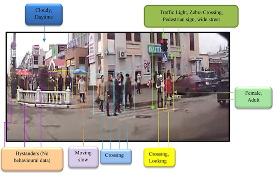 Ego-vehicle dynamics, such as speed and relative displacement, play a significant role in predicting pedestrian intentions. The fusion of ego-vehicle features with pedestrian-specific or scene-specific data provides a more comprehensive understanding of the scene and improves the accuracy of intention predictions [4,38,40,62,92,93,94]. These features encompass aspects such as the speed of the ego-vehicle and its relative displacement in relation to the target pedestrian. Figure 4 illustrates an example of contextual data annotation [95] from an image in the JAAD dataset.