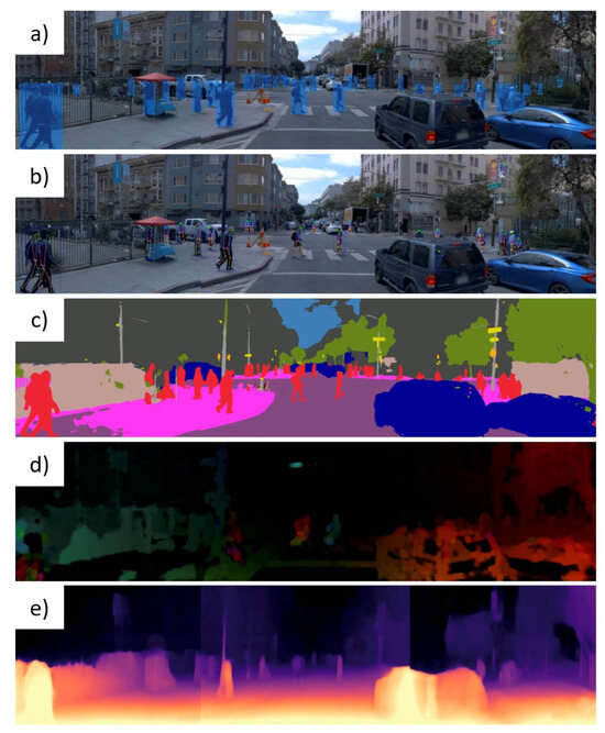 Analyzing pedestrian’s features and traffic scene dynamics involves the following: (a) localizing pedestrians using bounding boxes; (b) gestures understanding through pose estimation; (c) categorizing objects using segmentation techniques; (d) comprehending overall motion patterns with optical flow; (e) calculating distances with a global depth heat-map [102].