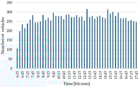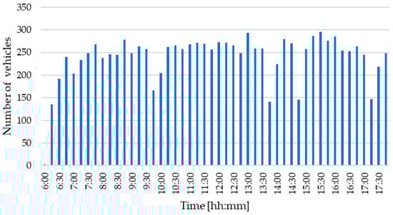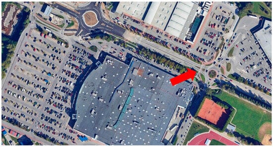 The traffic survey was carried out on a local road in the city center, directly adjacent to a shopping center generating significant traffic volumes throughout the day. This location was deliberately chosen due to its high and variable traffic flow, which includes passenger cars, freight vehicles, deliveries, and transit traffic. To improve the traffic situation in such areas, it is advisable to encourage as many residents as possible to use public transportation. In addition to reducing congestion, this would also enhance safety and decrease emissions [33,34,35].