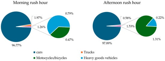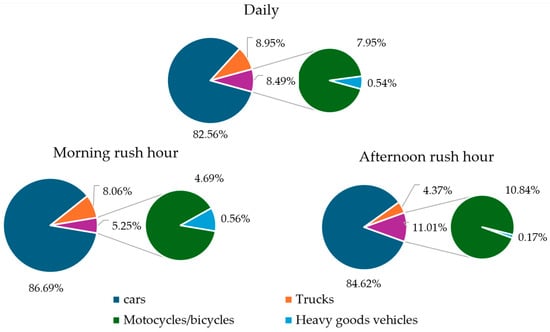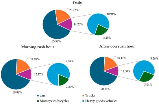 Based on the collected data, the following Table 3 and graphs depicting the traffic flow composition were generated, as shown in Figure 7.