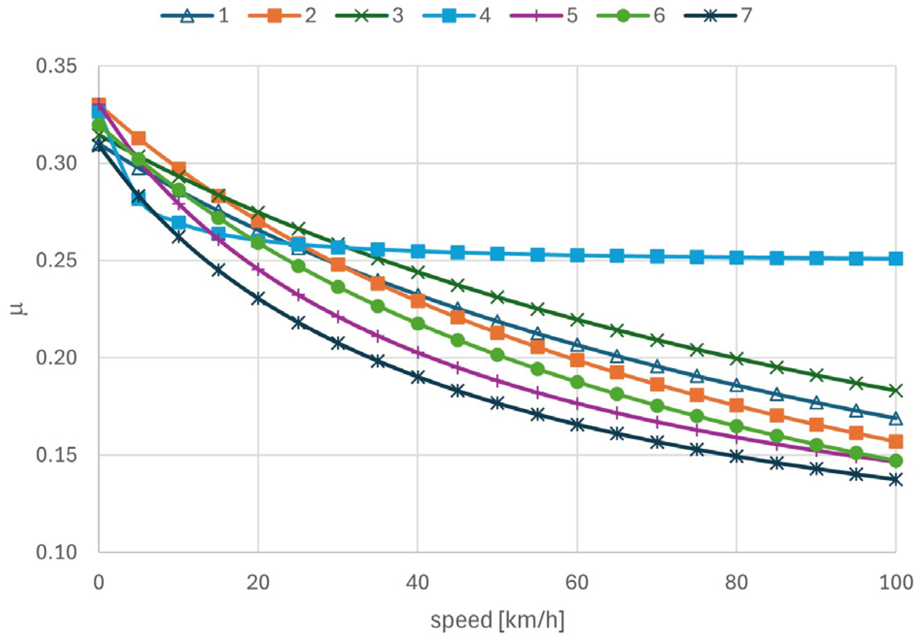 | Calculations of Lb [m] Performed with V0 = 50 km/h | Dry, μ0 = 0.3 | Wet, μ0 = 0.2 | Moist, μ0 = 0.15 | Contaminated, μ0 = 0.1 |
