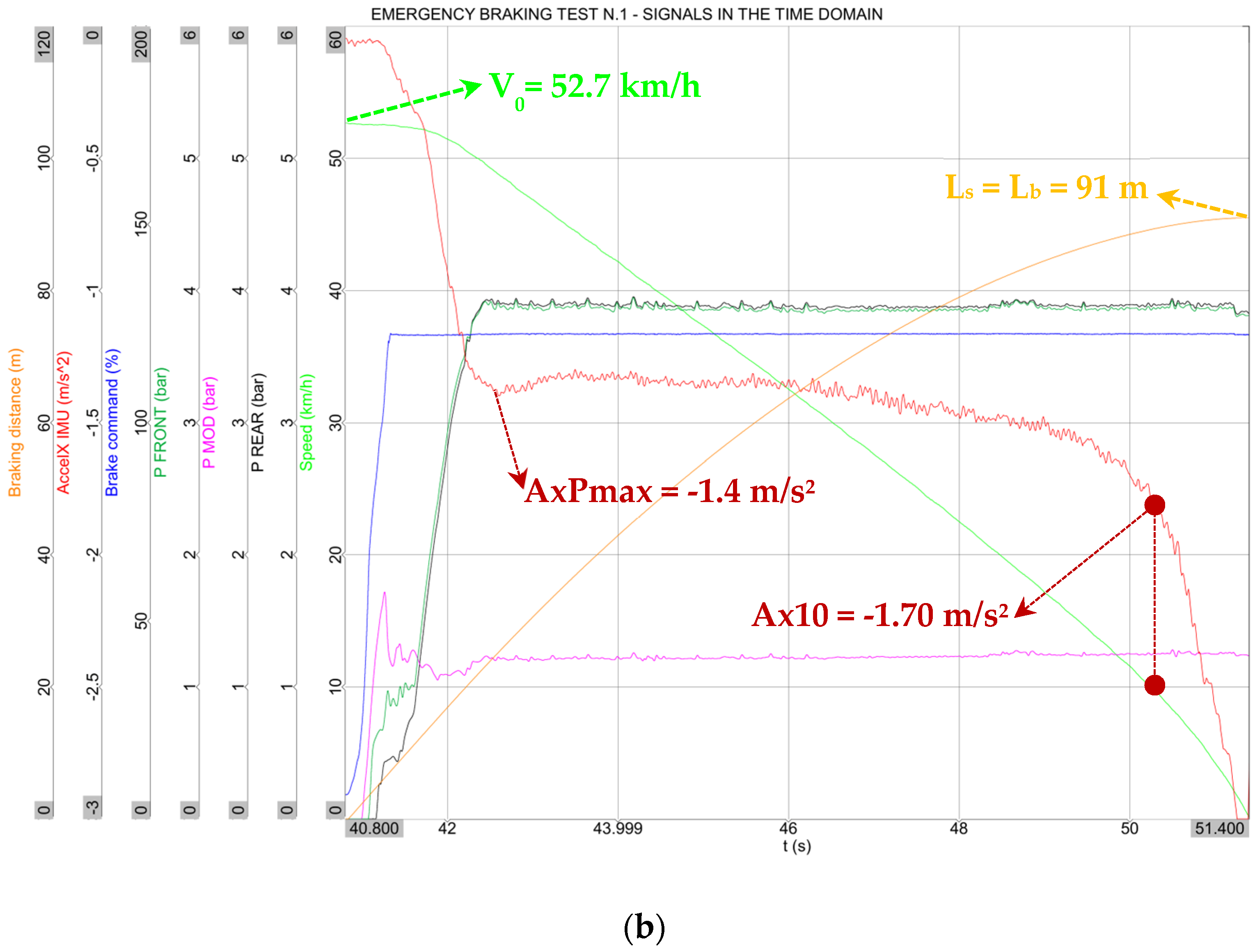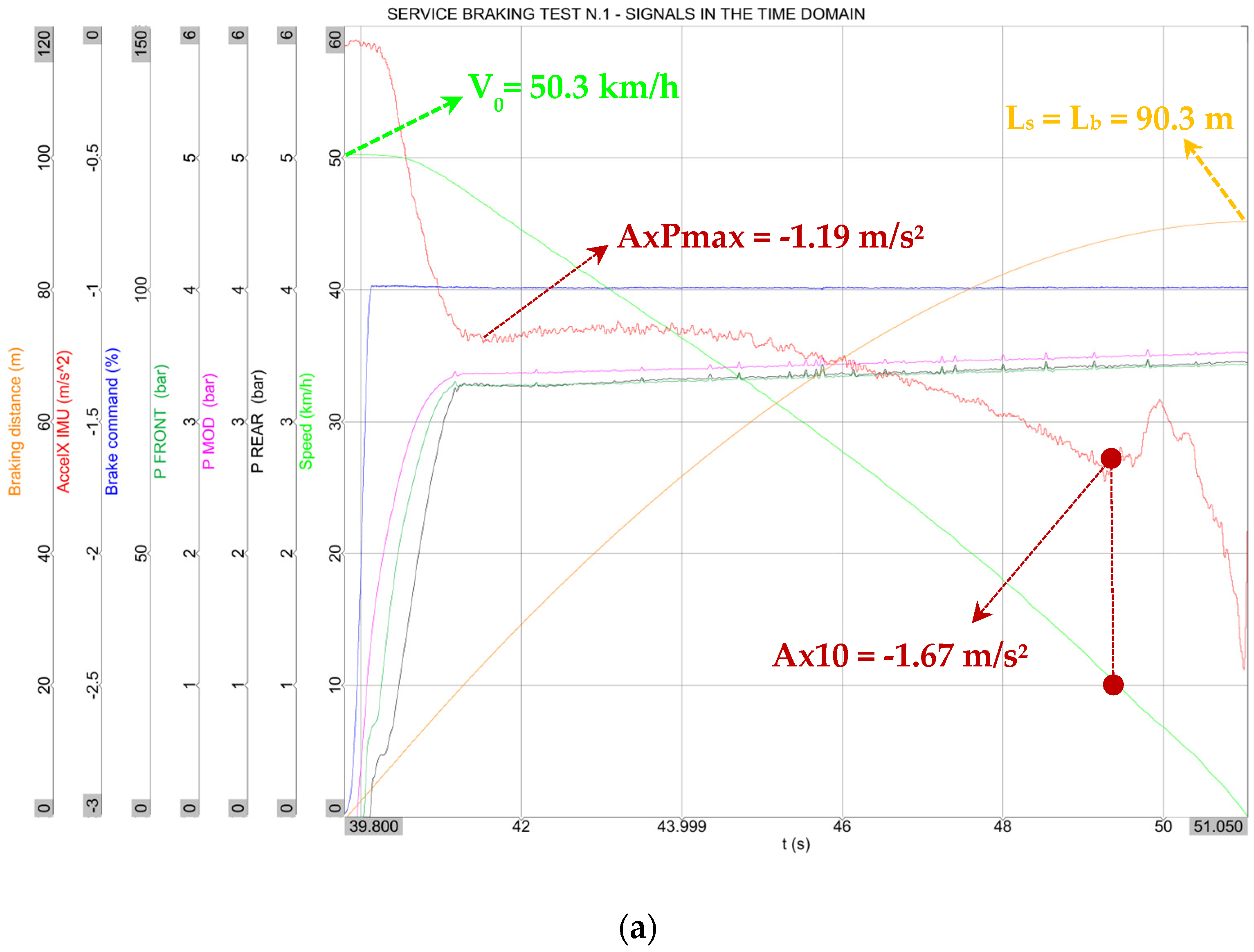 - “Brake command” [%] (blue curve) is the normalized position of the braking lever device actuated by the driver. The 100% value is obtained at the maximum admittable rotation of the lever in the service braking operation, while the driver has to rotate the lever to a further angle to initiate emergency braking operation, raising the brake command to 120% in this case.