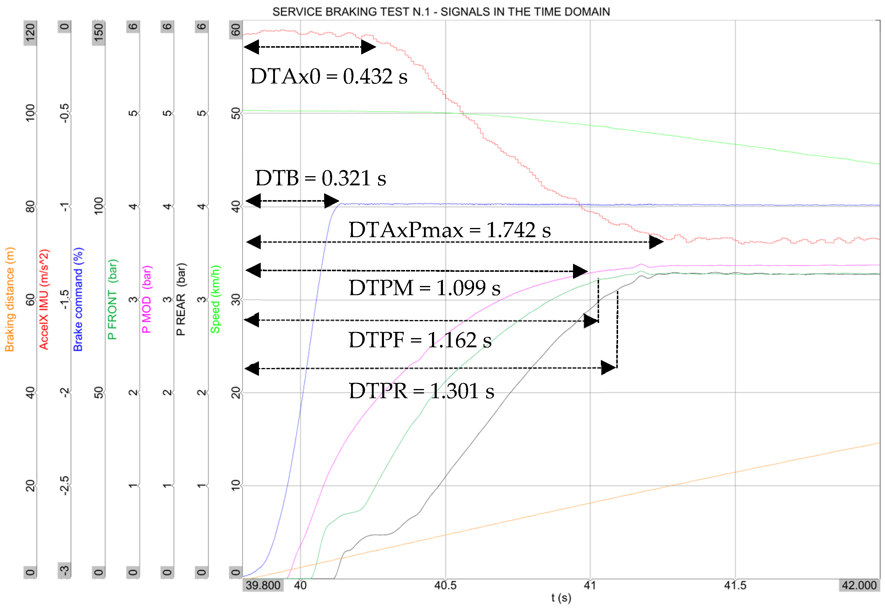 - DTPM [s] is the time to reach 95% of the maximum modulated pressure (this parameter is calculated in service braking only);