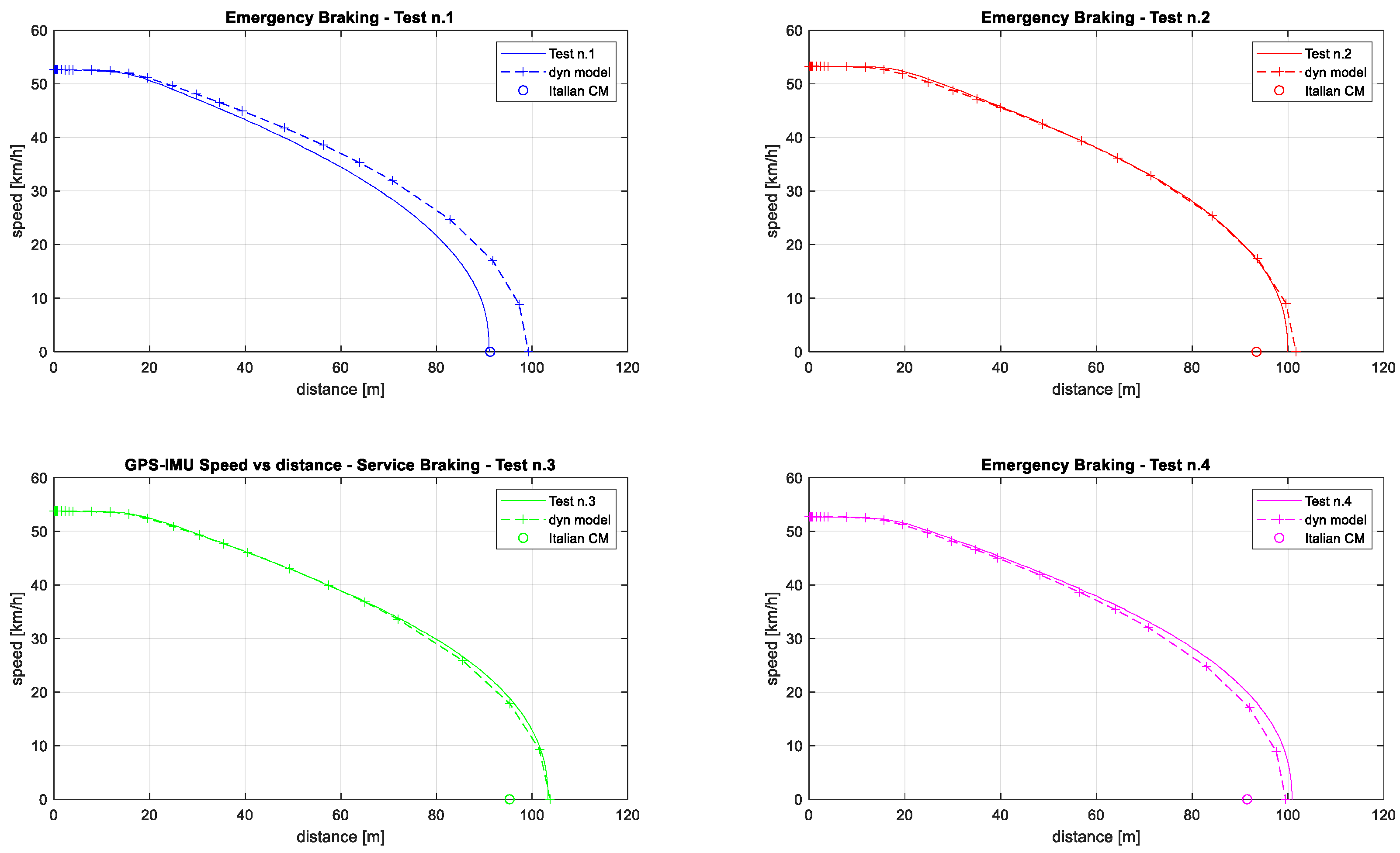 4.7. Validation of the Dynamics Model for Emergency Braking and Comparison to Empirical Formulas