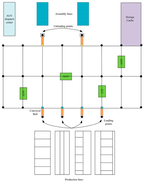 Each task can only be assigned to one AGV, and tasks are continuous. Once a transportation task is assigned to an AGV, that AGV is responsible for transporting the product to its destination until the task is completed. Each AGV can only perform the current task and will not accept another until the current task is finished. All AGVs travel at the same uniform speed, with no significant difference in speed between loaded and unloaded conditions, effectively avoiding conflicts caused by overtaking. When an AGV reaches a node on the path, it must wait for the AGV already occupying that node to depart before continuing its journey. The loading and unloading time for each AGV per task is fixed at t, with no significant differences in time during startup or stoppage. Products are conveyed along the path from the product placement area to the adjacent nodes via a conveyor belt, and AGV loading and unloading points are set within the network. After completing the task, the AGV will return to its starting station.