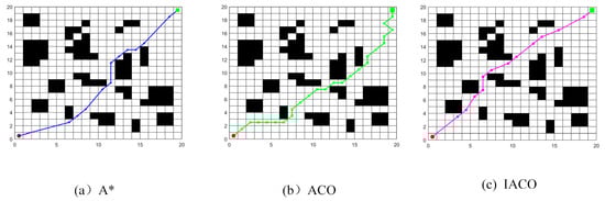 In a 20 × 20 grid environment, the pathfinding performances of three algorithms are as follows: The Improved Ant Colony Optimization (IACO) demonstrates the best performance, with a path length of 27.56 and a running time of only 0.028 s. Benefiting from optimized pheromone update strategies and heuristic guidance, IACO balances path optimality and computational efficiency. The A* alg orithm, with a path length of 27.87, approaches IACO’s optimization level but requires a longer running time (0.063 s), as its heuristic search traverses more nodes to ensure path optimality. The original Ant Colony Optimization (ACO) exhibits the longest path (28.31) and poorest optimization; although its running time (0.048 s) is faster than A*, its early-stage random exploration leads to circuitous paths. Overall, by integrating heuristic information, IACO breaks through the limitations of traditional ant colony algorithms, achieving a balance between path quality and operational efficiency in static scenarios, which provides a foundation for further testing in subsequent research, as shown in Table 4.