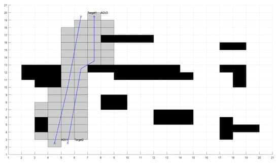 A 21 × 21 grid map was constructed to simulate the layout of a production workshop, with obstacles added to the map. Taking the example of two AGVs simultaneously performing transportation tasks, the starting and destination points for each AGV were predefined. The global path planning results for the multi-AGV system are shown in Figure 9 and Figure 10.