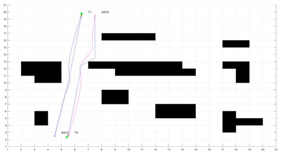 To verify the path planning capability and coordination efficiency of the multi-AGV system in a dynamic environment, a simulated experimental scenario was constructed, and a map containing obstacles was designed, as shown in Figure 12. In the experiment, two AGVs started from different initial points and completed their respective tasks through path planning and obstacle-avoidance strategies. The experimental results are shown in Table 6.