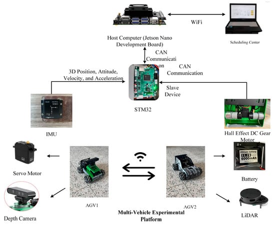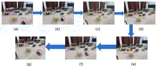 From the path planning results, it can be observed that the path planning algorithm used by the multi-AGV system exhibits good adaptability in avoiding both static and dynamic obstacles. In the experiment, when AGV1 approached the target area, it adjusted its original path upon encountering a dynamic obstacle. The real-time obstacle-avoidance strategy successfully mitigated potential collision risks. Similarly, AGV2 maintained a safe distance from AGV1 at the path intersection and replanned its path to avoid direct conflict. This demonstrates that the multi-AGV system is capable of achieving optimal path selection through information sharing and dynamic adjustment.