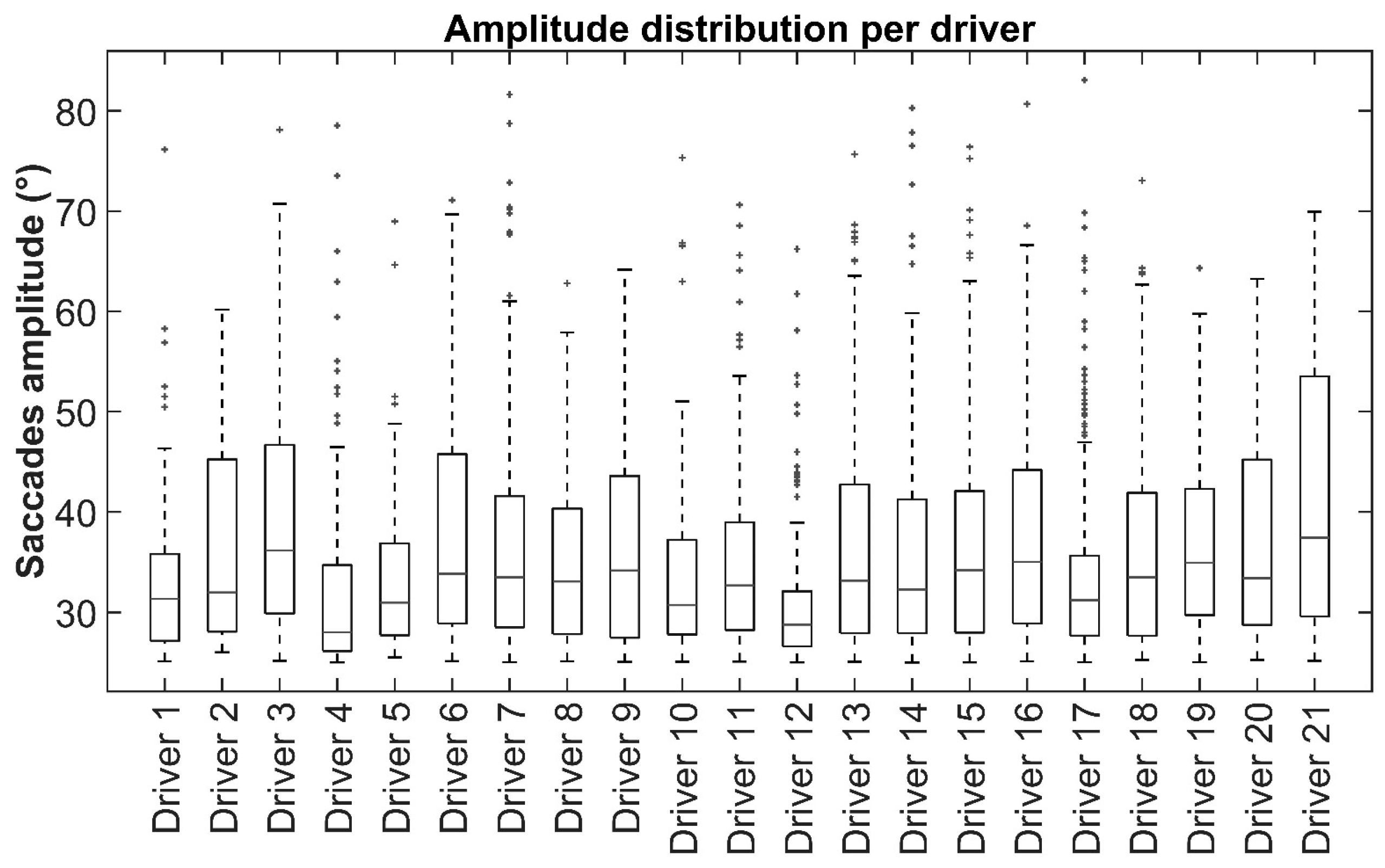 Figure 11. Distribution of saccadic amplitude for the drivers’ sample; + in the figure represents the outliers.