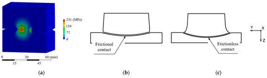 (a) Equivalent stress (Von Mises) in cross-sectional view; (b) comparison of deformation with friction; and (c) without friction at contact time (deformation factor ×2).