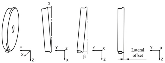 To describe wheel modeling, a global coordinate system is adopted, as shown in Figure 1a: