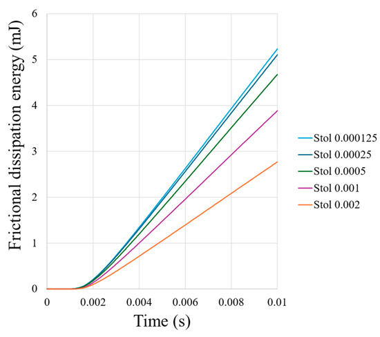 Therefore, Stol is treated as a tuning parameter and should be adjusted through parametric analysis, seeking a balance between numerical convergence and the accuracy of energy dissipation estimation in the contact interface. Based on this trade-off and the required level of accuracy, a value of 0.00025 was selected. This choice is supported by the results obtained for dissipated energy in the contact region (Figure 4), showing an error of approximately 2% with respect to the accumulated frictional dissipated energy compared to the next configuration. This approach provides a practical way to automate the selection of the elastic slip tolerance (slto) parameter based on quantitative energy dissipation criteria.
