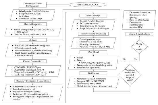 A flowchart of the modeling methodology is provided in Figure 5, summarizing the main steps from geometry definition to verification. The figure details all substeps of the workflow, including meshing strategy, material properties, five-step loading sequence, contact formulation, solver settings, post-processing routines, and wear calculation.