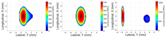 The distributions of contact pressures under the applied loading conditions are obtained and post-processed in MATLAB R2023a. Figure 6 shows examples of the results for different cases, illustrating the pressure magnitudes and patch dimensions.