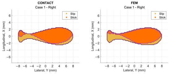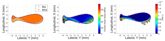 Tangential results—namely shear stress distribution, slip, and stick–slip partitioning—are directly obtained from the contact formulation of Section 2.3.1 and subsequently post-processed in MATLAB R2023a. Figure 7 illustrates representative outputs of these quantities.
