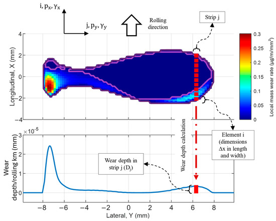 | Wear depth in strip j per rolling distance |