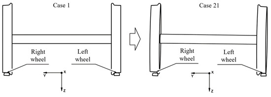 - Cho, Y.; Kwak, J. Development of a New Analytical Model for a Railway Vehicle Equipped with Independently Rotating Wheels. Int. J. Automot. Technol. 2012, 13, 1047–1056. [Google Scholar] [CrossRef]