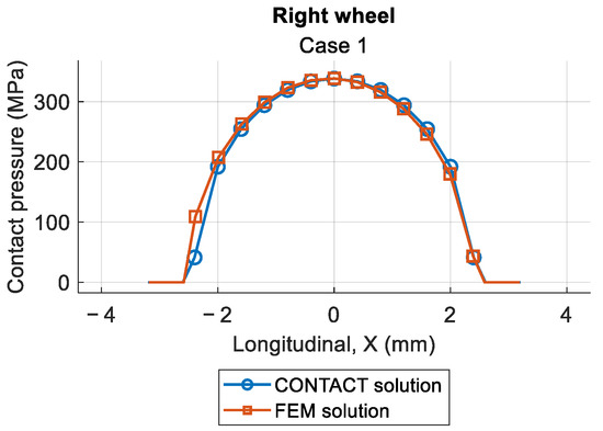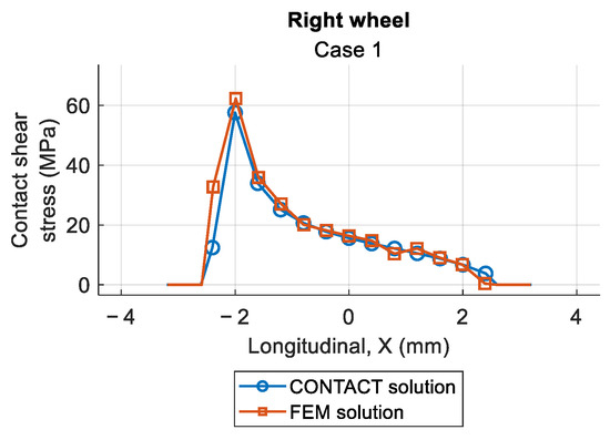 This work developed and verified a quasi-static FEM framework for wheel–rail contact, systematically benchmarked against the reference software CONTACT. The model accurately reproduced contact pressures, shear stresses, force components, and stick–slip distributions over the 11 odd-numbered Manchester Benchmark cases (both wheels), with quantified errors (MAE and RMSE) within acceptable limits for nonlinear contact simulations.