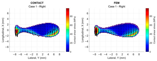 The quasi-static implicit formulation employed provides a significant reduction in computational cost compared with transient FEM models, while preserving high accuracy. This makes the framework suitable for large parametric studies requiring multiple simulations. Verification against CONTACT confirms strong agreement: percentage differences in contact pressures, shear stresses, and resultant forces remain within acceptable ranges for nonlinear contact problems. Stick–slip partitions also match closely, with deviations of less than 1.9% in adhesion area across the studied cases.