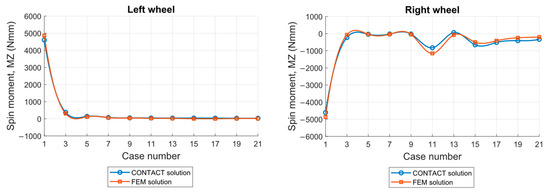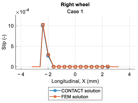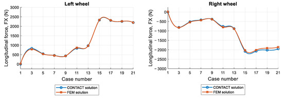 The following supporting information can be downloaded at: https://www.mdpi.com/article/10.3390/vehicles7030104/s1. Supplementary Section S1: Parameters used in the FEM implementation; Supplementary Section S2: Per-case FEM vs. CONTACT relative errors; Supplementary Section S3: Summary statistics; Supplementary Section S4: Wear depth accuracy metrics; Supplementary Section S5: Contact pressure distributions in the contact patch. CONTACT-FEM comparison. Results for Cases 1 to 21; Supplementary Section S6: Longitudinal section view of the contact pressure. CONTACT-FEM comparison. Results for Cases 1 to 21; Supplementary Section S7: Stick/slip zone distributions in the contact patch. CONTACT-FEM comparison. Results for Cases 1 to 21; Supplementary Section S8: Contact shear stress distributions in the contact patch. CONTACT-FEM comparison. Results for Cases 1 to 21; Supplementary Section S9: Longitudinal section view of the contact shear stress. CONTACT-FEM comparison. Results for Cases 1 to 21; Supplementary Section S10: Slip distributions in the contact patch. CONTACT-FEM comparison. Results for Cases 1 to 21; Supplementary Section S11: Longitudinal section view of the slip. CONTACT-FEM comparison. Results for Cases 1 to 21.