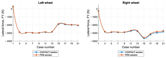 The main contributions of this study can be summarized as follows: (i) the development of a quasi-static FEM framework that combines rigid–flexible domain partitioning, a frictionless preconditioning strategy, and automated slip-tolerance tuning, ensuring both accuracy and computational efficiency; (ii) comprehensive verification against CONTACT, including a statistical assessment of errors across normal and tangential variables; and (iii) the establishment of a parametrizable basis for future studies of independently rotating wheels (IRWs), in which geometric variables such as toe and camber angles can be systematically explored, with direct relevance to passive steering concepts in Talgo trainsets.