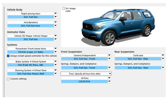 Currently, commonly used vehicle simulation software includes CarSim2020 and Simulink2023a. Among them, CarSim2020 is widely used in vehicle stability studies under complex conditions such as crosswinds due to its convenient modeling, fast simulation speed, strong visualization capabilities, and modular interfaces for the vehicle body, tires, and aerodynamics, as shown in Figure 1.