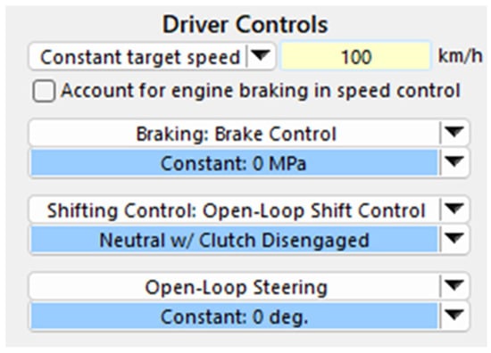 This study uses the open-loop driving control mode in CarSim to eliminate the influence of driver intervention on the vehicle’s dynamic response, aiming to more accurately reflect the actual and critical safety conditions of driving on desert highways. For this purpose, a vehicle speed of 100 km/h is selected as the typical operating condition, which aligns with the speed limit on high-grade highways in desert regions of China and represents the speed range at which medium and small vehicles are most sensitive to crosswind disturbances. This speed setting effectively identifies the impact of factors such as wind speed, wind direction, and sand accumulation on vehicle stability, and holds representational and engineering reference value. In this mode, the vehicle maintains a constant throttle, engine braking, or braking, with the transmission in neutral and the steering wheel kept at 0 degrees, as shown in Figure 4. It is primarily used to study the effects of external disturbances (such as crosswind, sand accumulation, etc.) on vehicle stability, making it suitable for verifying the stability boundaries under passive responses.