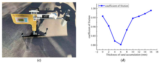 Relationship between sand accumulation thickness and friction coefficient. (a) National Highway 315 conditions; (b) measured sand accumulation thickness; (c) pendulum friction tester measurement diagram; (d) friction coefficient variation curve.