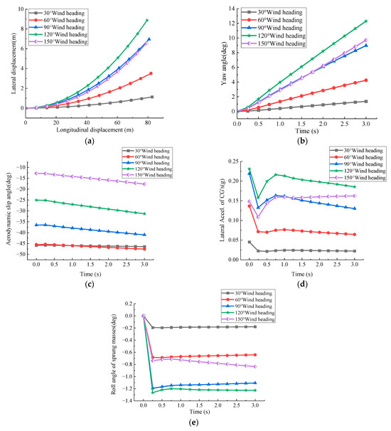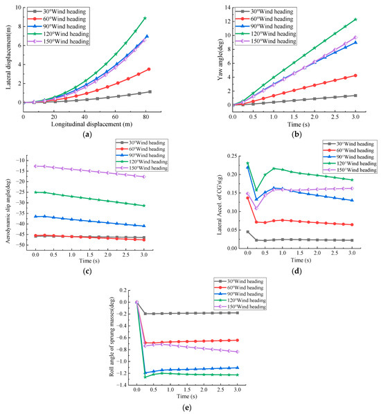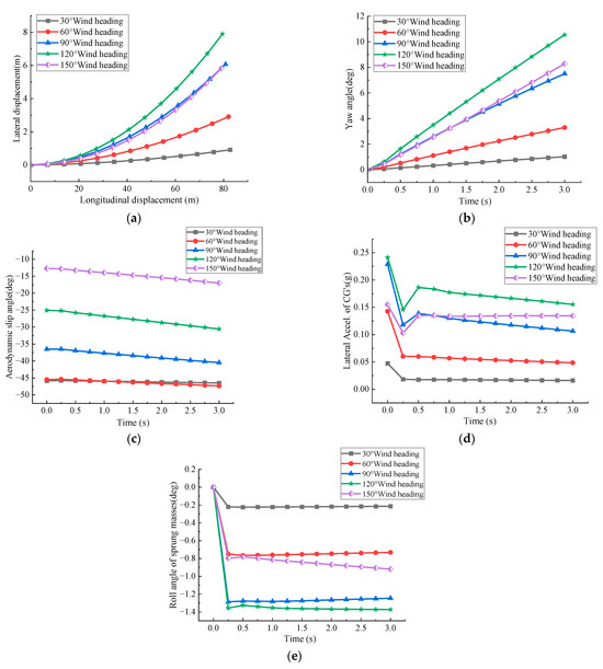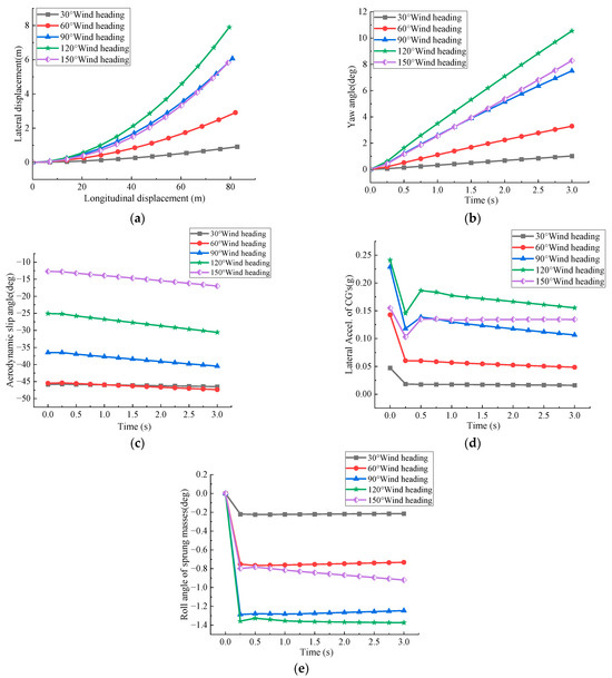 Effect of different wind direction angles on the small SUV at 100 km/h under sand-free road conditions. (a) Lateral displacement at 17.1 m/s wind speed; (b) yaw angle at 17.1 m/s wind speed; (c) aerodynamic sideslip angle at 17.1 m/s wind speed; (d) lateral acceleration at 17.1 m/s wind speed; (e) roll angle at 17.1 m/s wind speed.