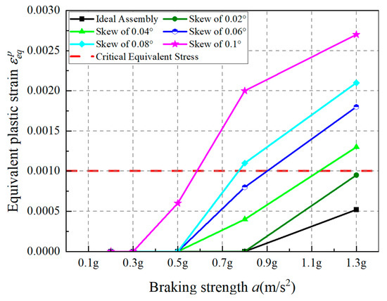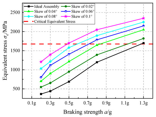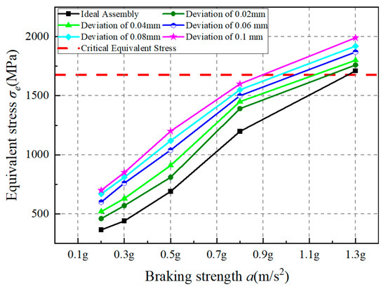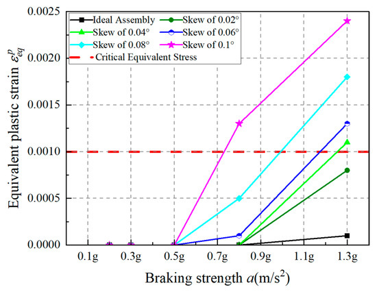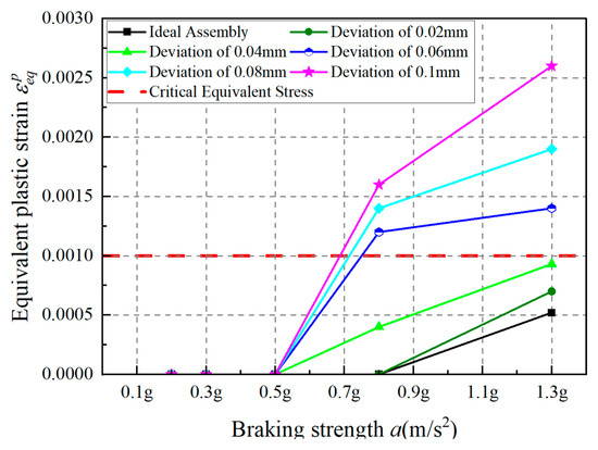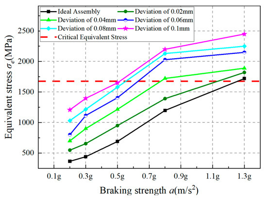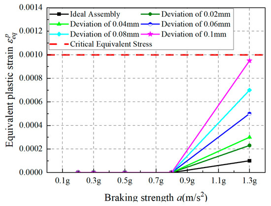 - The DPRS mechanism will exceed the critical equivalent plastic strain under specific braking intensities (e.g., 0.8–1.3 g) when either the screw’s deviation distance surpasses 0.06 mm or the roller’s inclination angle exceeds 0.04°, thereby compromising the normal operation of DPRS and the operational reliability of the EMB system actuator.