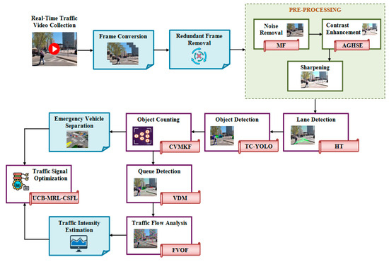Here, the proposed methodology for the effective TSO model based on multi-object via traffic flow analysis and intensity estimation using UCB-MRL-CSFL is demonstrated. This framework mainly concentrates on enhancing TSO by focusing not only on the traffic flow but also on pedestrians, cyclists, and other non-motorized road users. The research methodology employs a reinforcement learning-based framework, which supports varying traffic conditions, including free-flow, moderate, and congested scenarios. In Figure 1, the proposed framework’s structural diagram is illustrated.